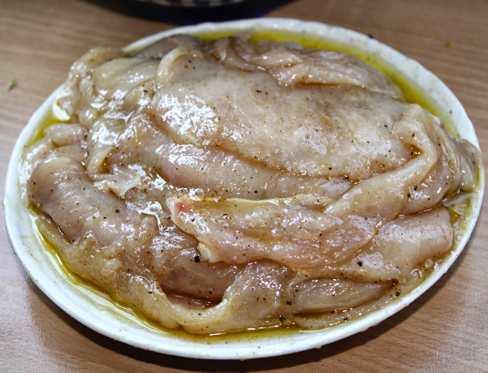 Vamos untando los filetes de pechuga en esta marinada y pasándolos a otro plato. Les echamos por encima la marinada que sobre.