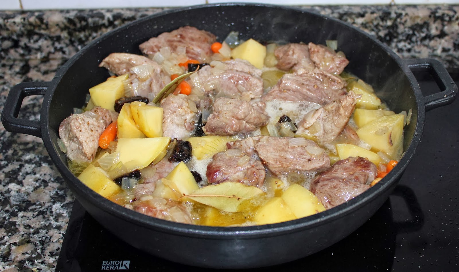 Finalmente incorporamos la carne, con los juguillos que haya podido soltar, el laurel y el vasito de sidra. Llevamos a ebullición y rectificamos de sal.